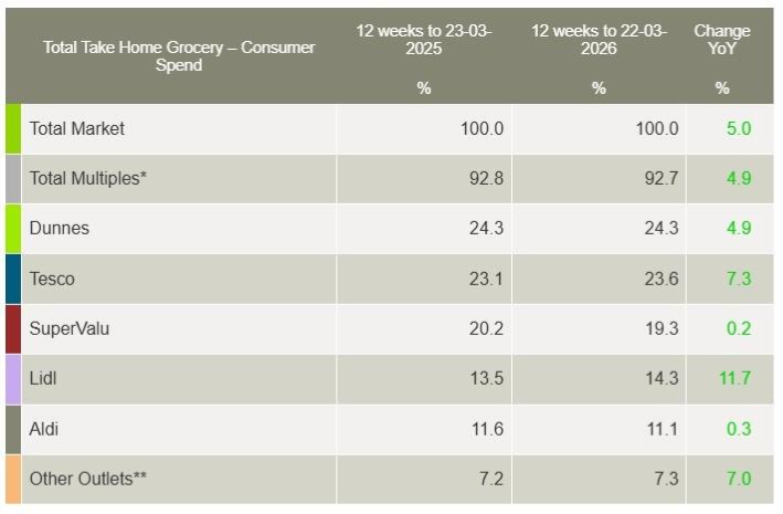 Take-home grocery sales in Ireland increased by 5.2% in the four weeks to 22 March 2026 compared with the same period last year, according to the latest data from Worldpanel by Numerator.